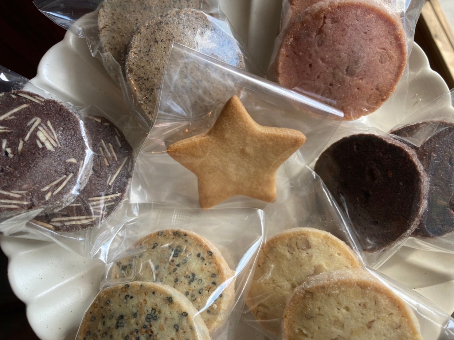 埼玉県産小麦粉、国産バター、砂糖、秩父産平飼い卵、アーモンドパウダー、ココア、ごま、紅茶、アーモンド、くるみ、チョコ、苺チョコ、苺パウダー、そば粉、生クリーム、はちみつ、塩
